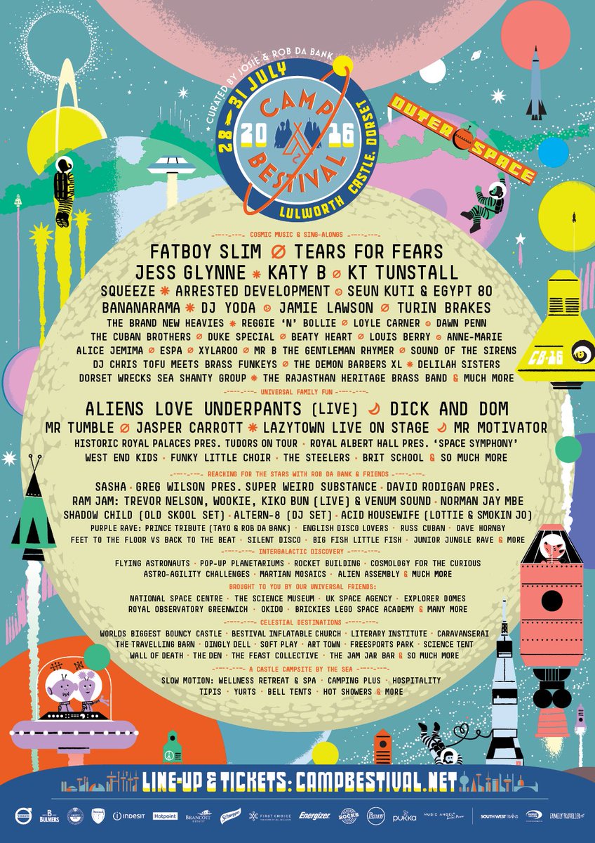 Camp Bestival Lulworth Castle 2016 Posted by: John Sutton Tags: Posted date: 6th June 2016 Camp Bestival Lulworth Castle 2016. Great bands include Fatboy Slim, Tears for Fears, Jess Glynee, Katy B, KT Tunstall, Squeeze, Arrested Development.